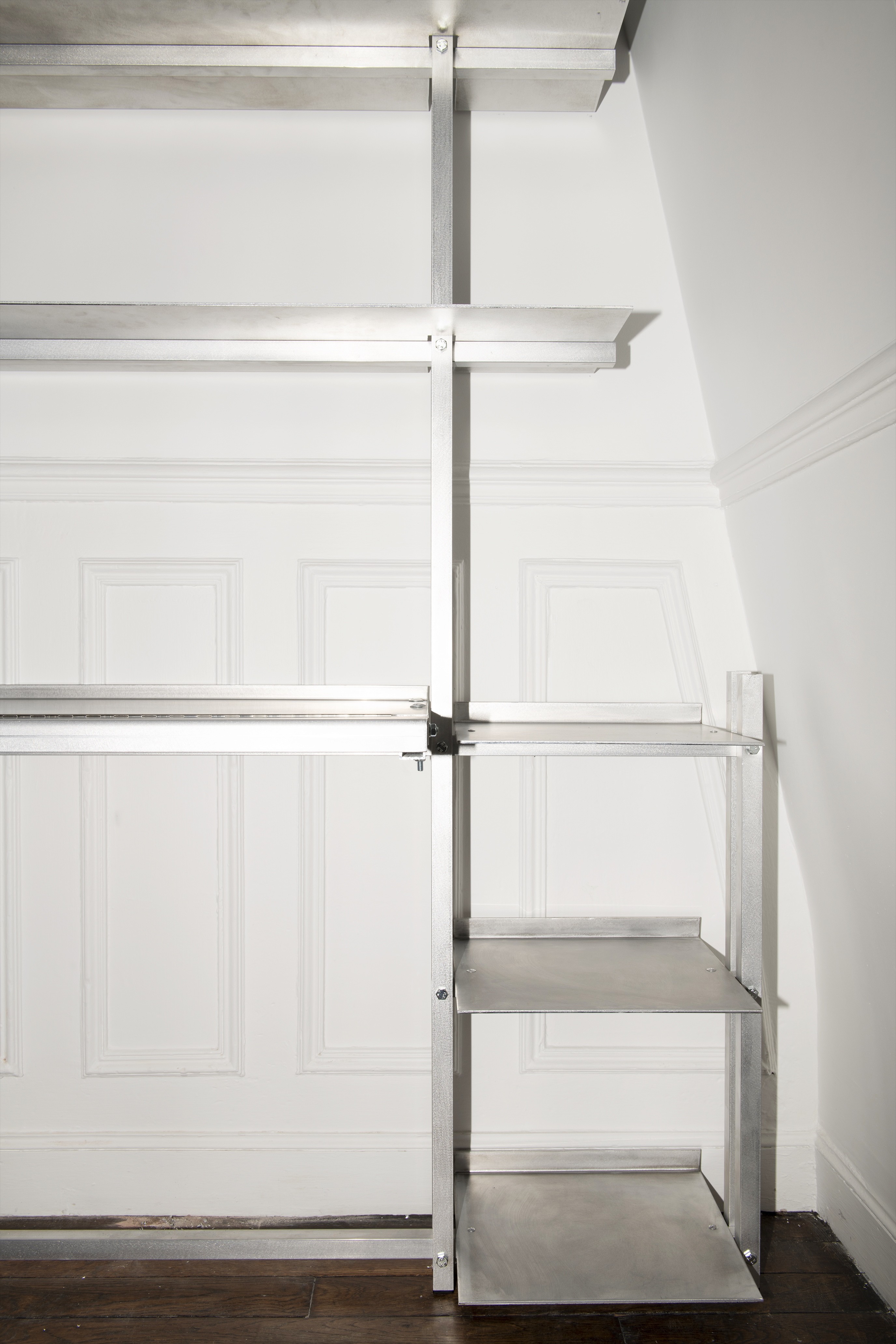 The shelving unit, made from aluminium sheets and tubes, is tailored to a space beneath a sloped roof. One of the shelves folds open to create a small desk area.