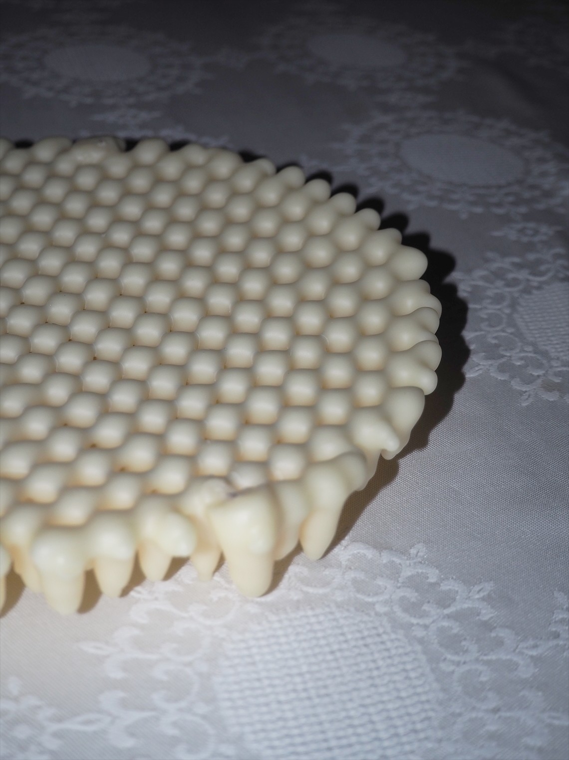 The first shapes are created by cutting and forming a steel grid, which is then repeatedly dipped into a bath of our melted natural wax blend. Through successive dipping and cooling, layers begin to build up around the metal, forming an outer shell of wax.