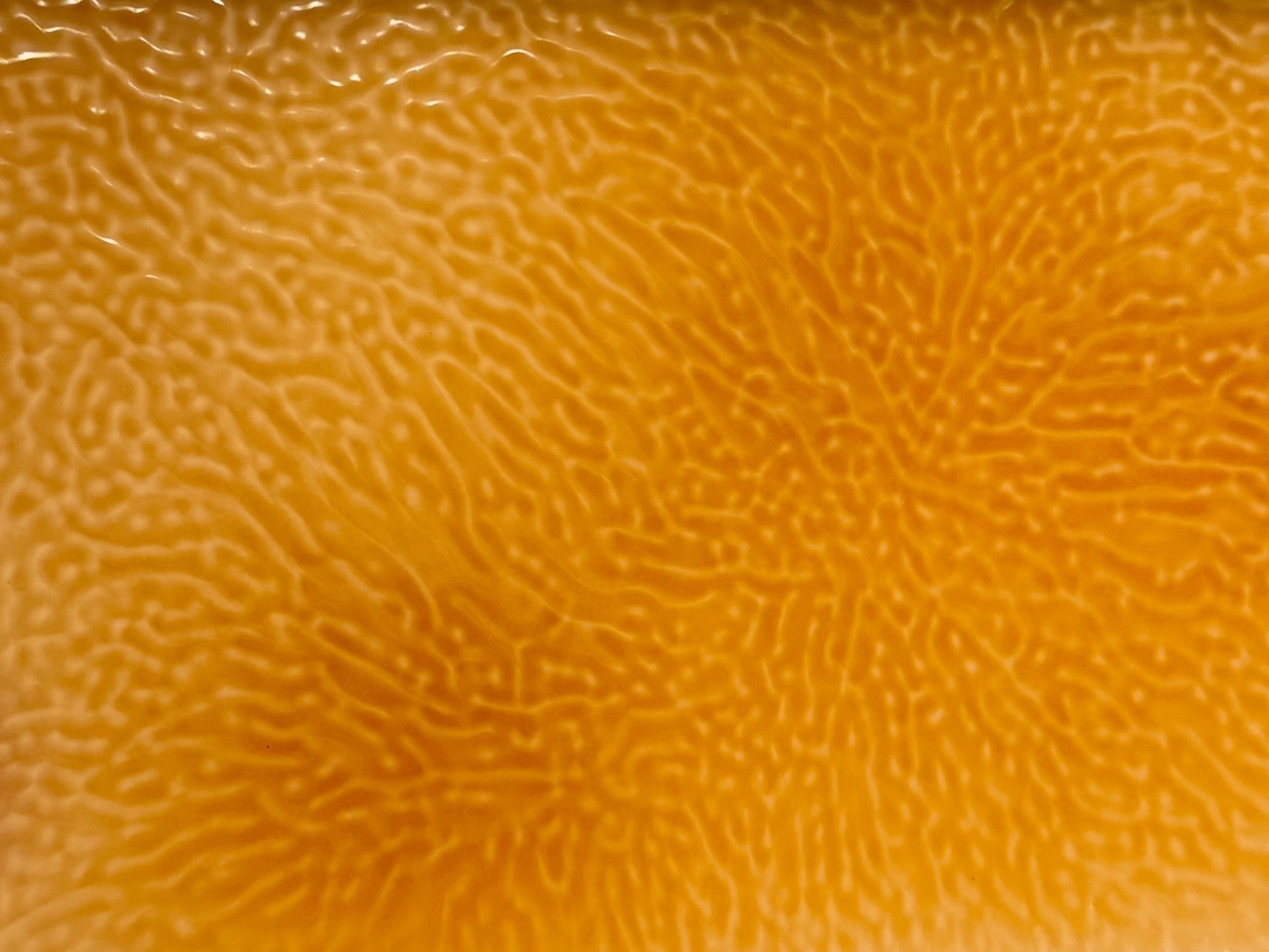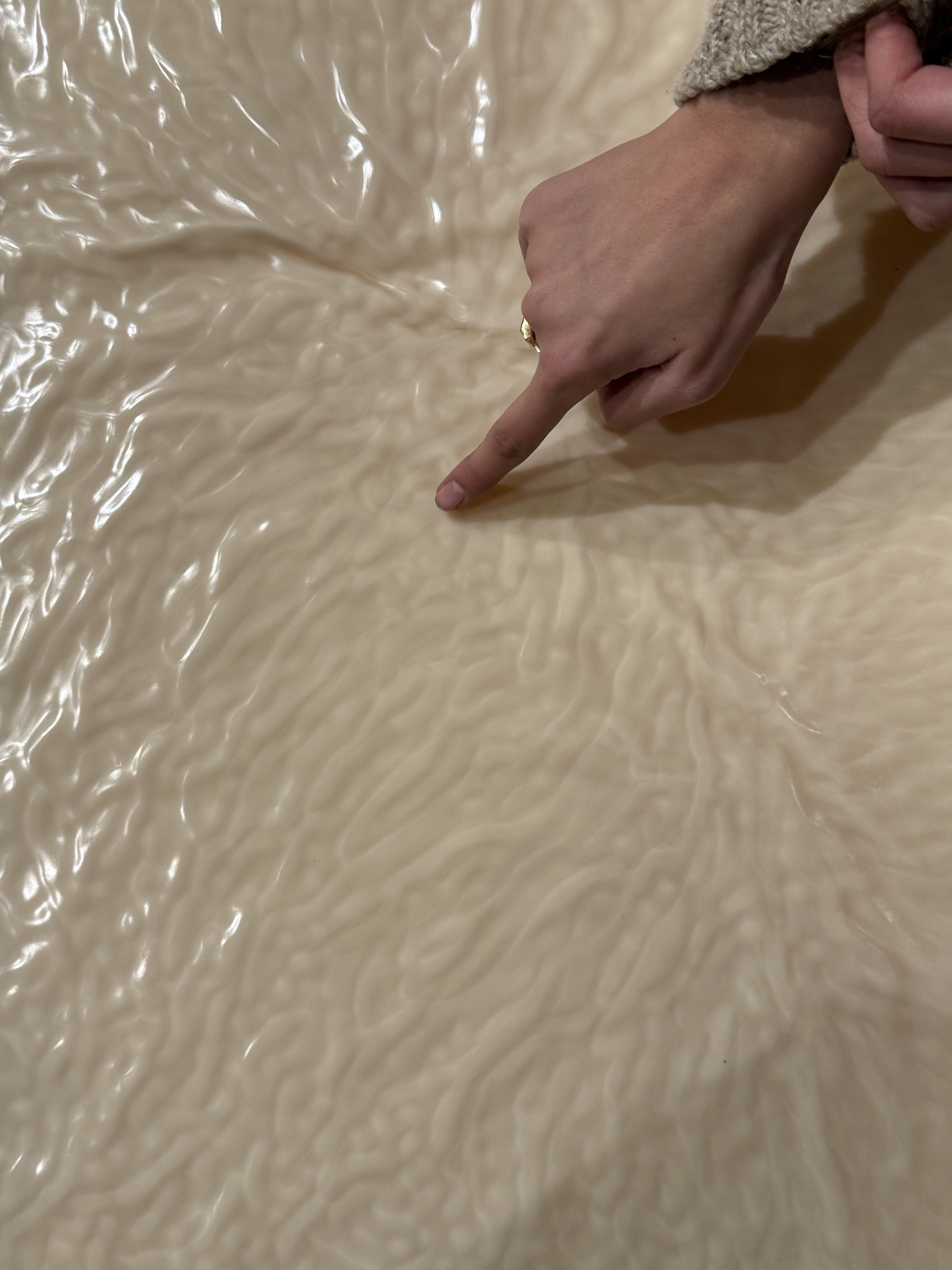 The pieces are displayed on a large backlit wax sheet made with our natural wax blend. The organic waves on the wax surface are created through controlled cooling, allowing us to guide both their direction and amplitude.